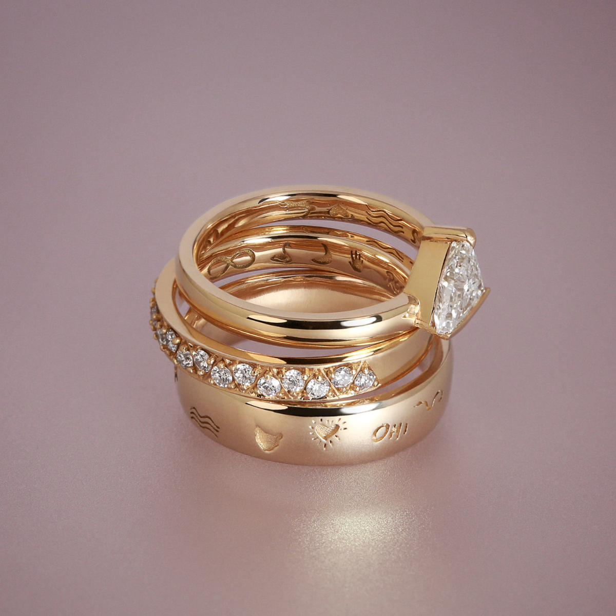 At this stage, you may choose to weave a deeper story into your piece with personalised engravings. Each glyph, hand-drawn by our Creative Director, Davina Adamson is a secret symbol engraved in gold, a private lexicon of love known only to you and your lover. Select from our existing motifs or collaborate with your designer to create your own spell.