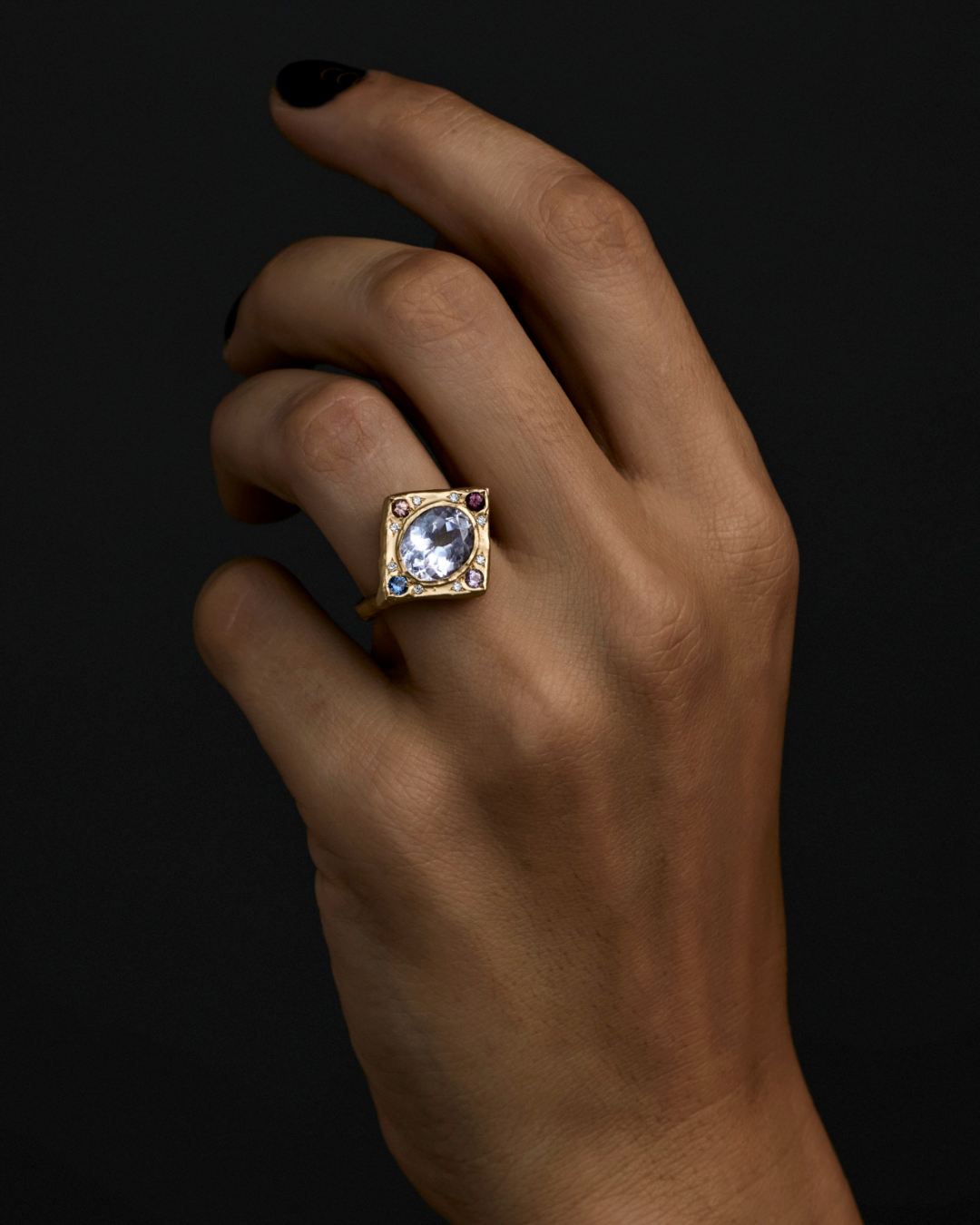 Named the "Astral Garden Ring", this piece is a dreamscape of light and colour, a portal to the otherworldly where flowers bloom, serpents spiral, and cosmic energies guide the way.
