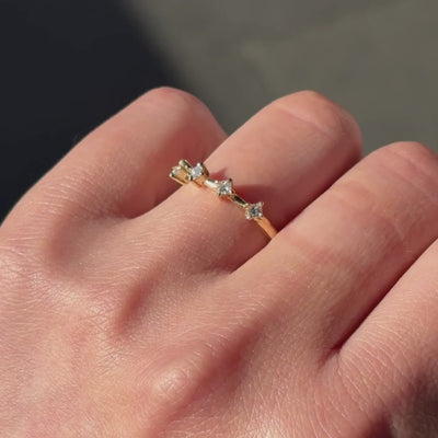 A delicate dance of princess cut white diamonds sitting raised on a fine band.