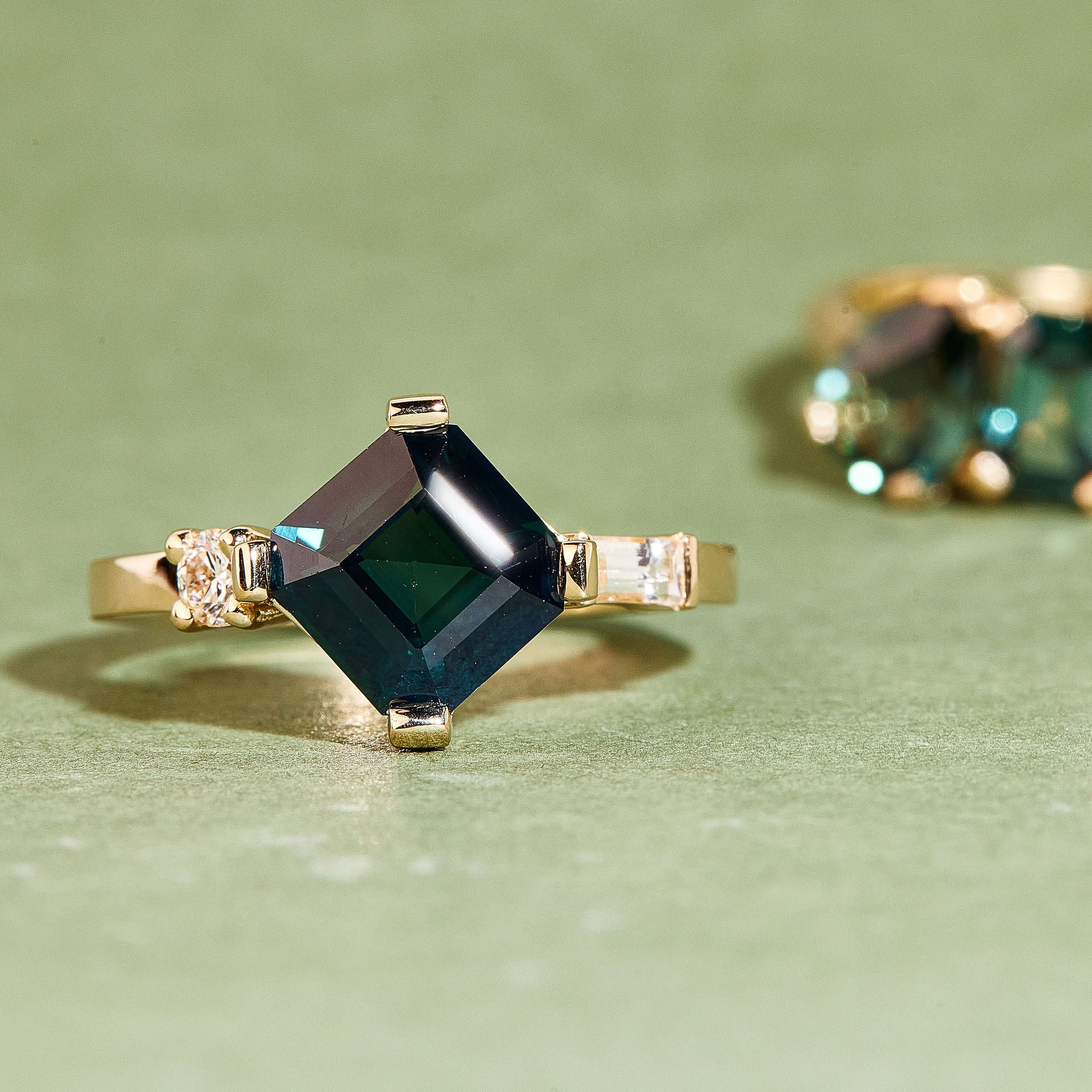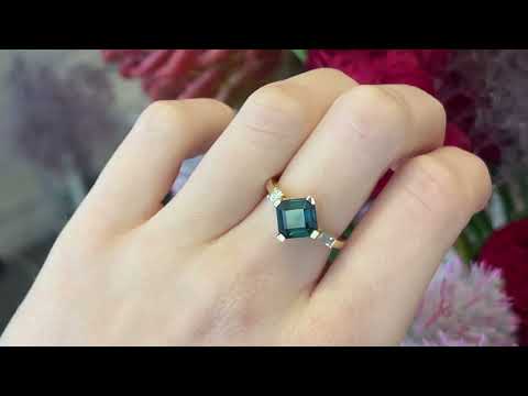 A 2.6ct asscher-cut Madagascan sapphire sits at the centre like a tranquil, deep pool of ocean blue. Set with tab claws on a flat squared band and flanked by crisp white diamonds, the design feels balanced and striking.