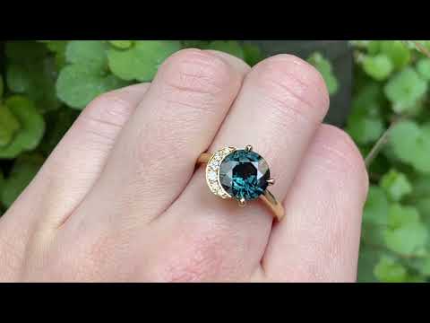 The Equinox Sapphire and Diamond Ring showcases a 3.26ct ethically sourced Australian teal sapphire, resembling the deep hues of twilight and the ever-changing phases of the moon, from waxing to waning. Encircled by a constellation of round brilliant cut white diamonds, set using a traditional stone setting technique, the design pays homage to the mystique of the night sky.