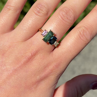 An alignment of emerald cut sapphires of deep green, vibrant teal, and muted blush, punctuated by a carré cut white diamond.