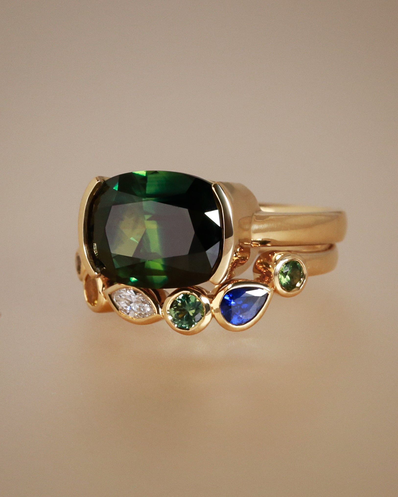 The Opus sapphire solitaire ring lets a 5.24ct cushion cut Australian teal sapphire speak for itself. Crafted in 18kt yellow gold and set in a raised open basket to allow for maximum light and shimmer.