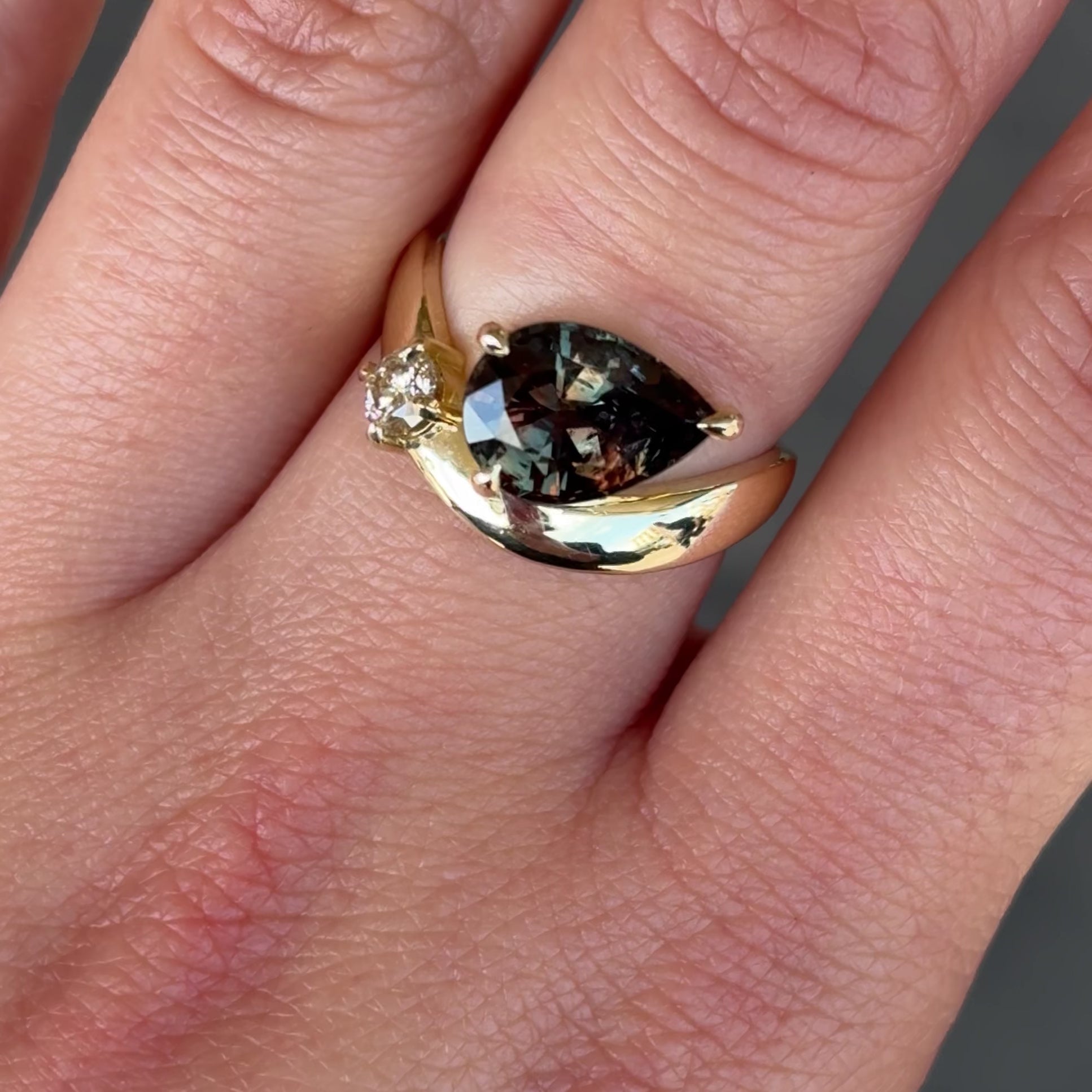 An exceptionally rare 3.24ct pear cut Australian sapphire with poolings of brown, blue, plum, and warm orange. A complex earthy palette captured in a single stone, revealing different facets of colour as the light shifts.