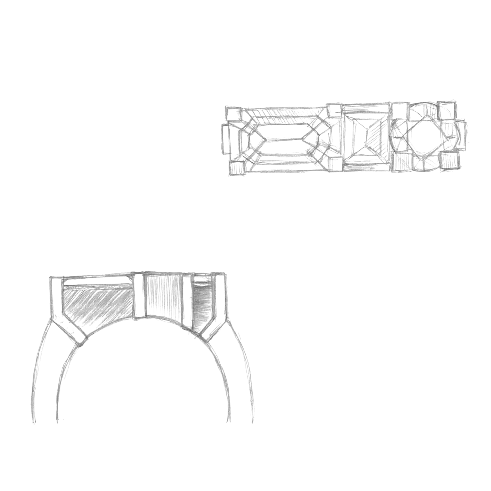 A modernist study in geometry, this yellow gold ring unites a rhythmic trilogy of distinct stones on a flat band, further accented with tab claws and an open basket setting.