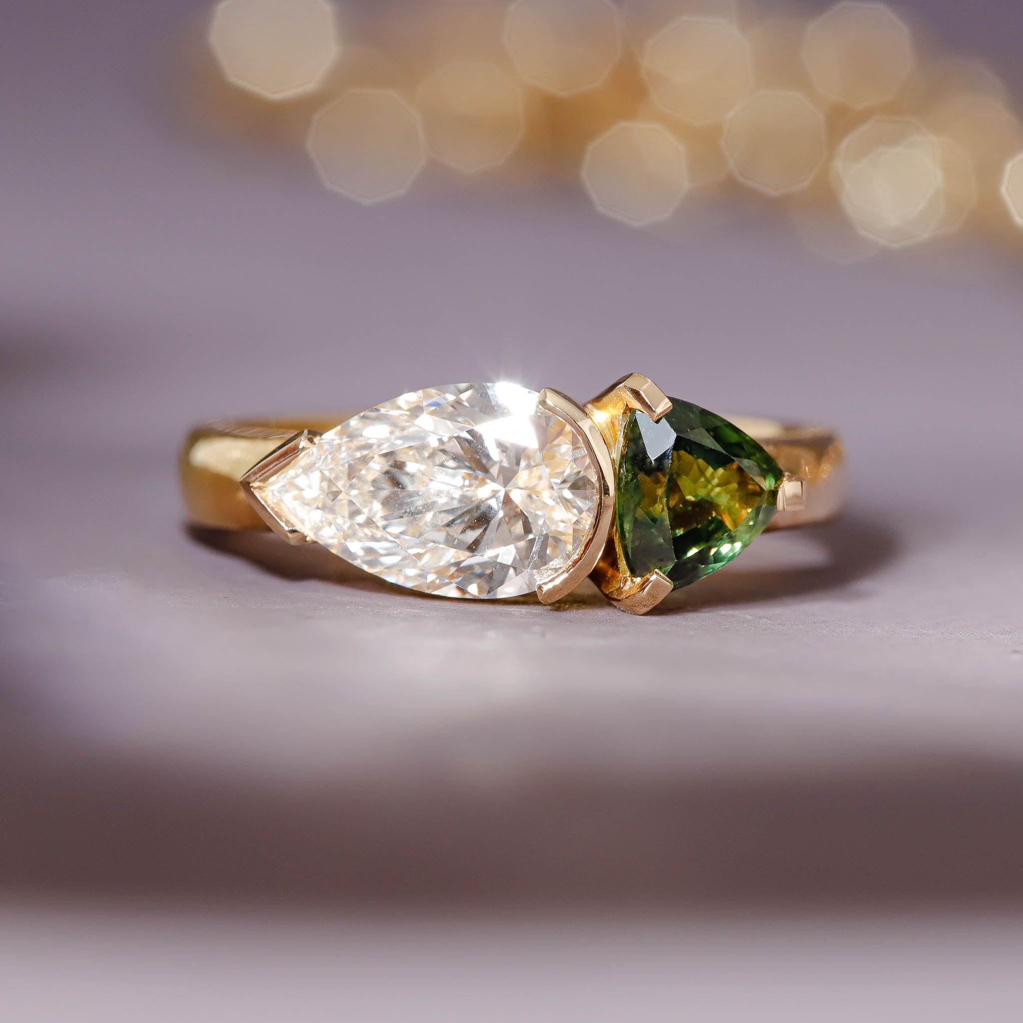 A captivating east-west set Toi et Moi engagement ring featuring a 1.6ct pear cut white diamond and a 0.91ct trillion cut green sapphire.