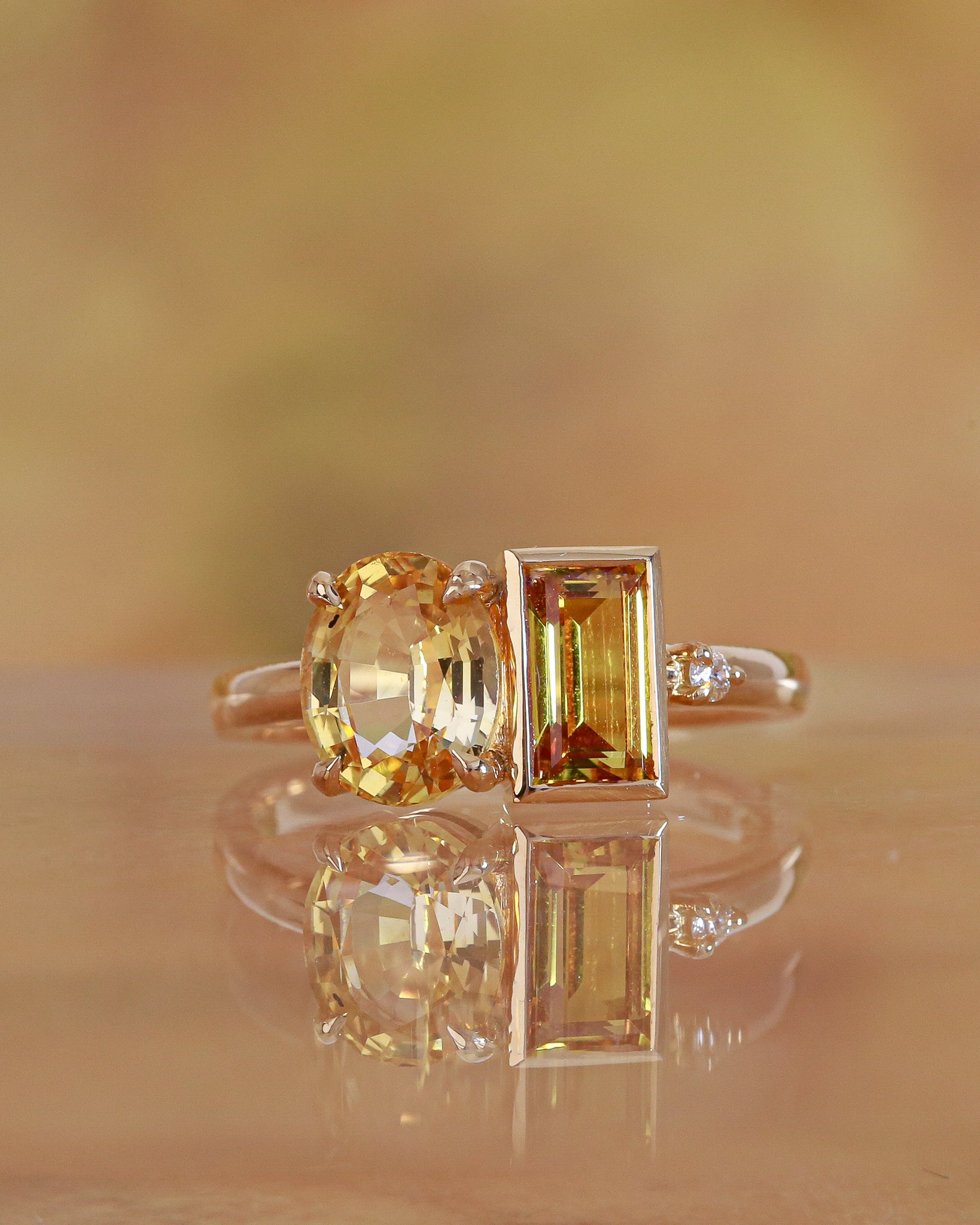 Golden light captured in form. This joyful two-stone sapphire ring glows with warmth and harmony. It features an oval cut yellow sapphire and baguette cut yellow sapphire in mixed setting styles.