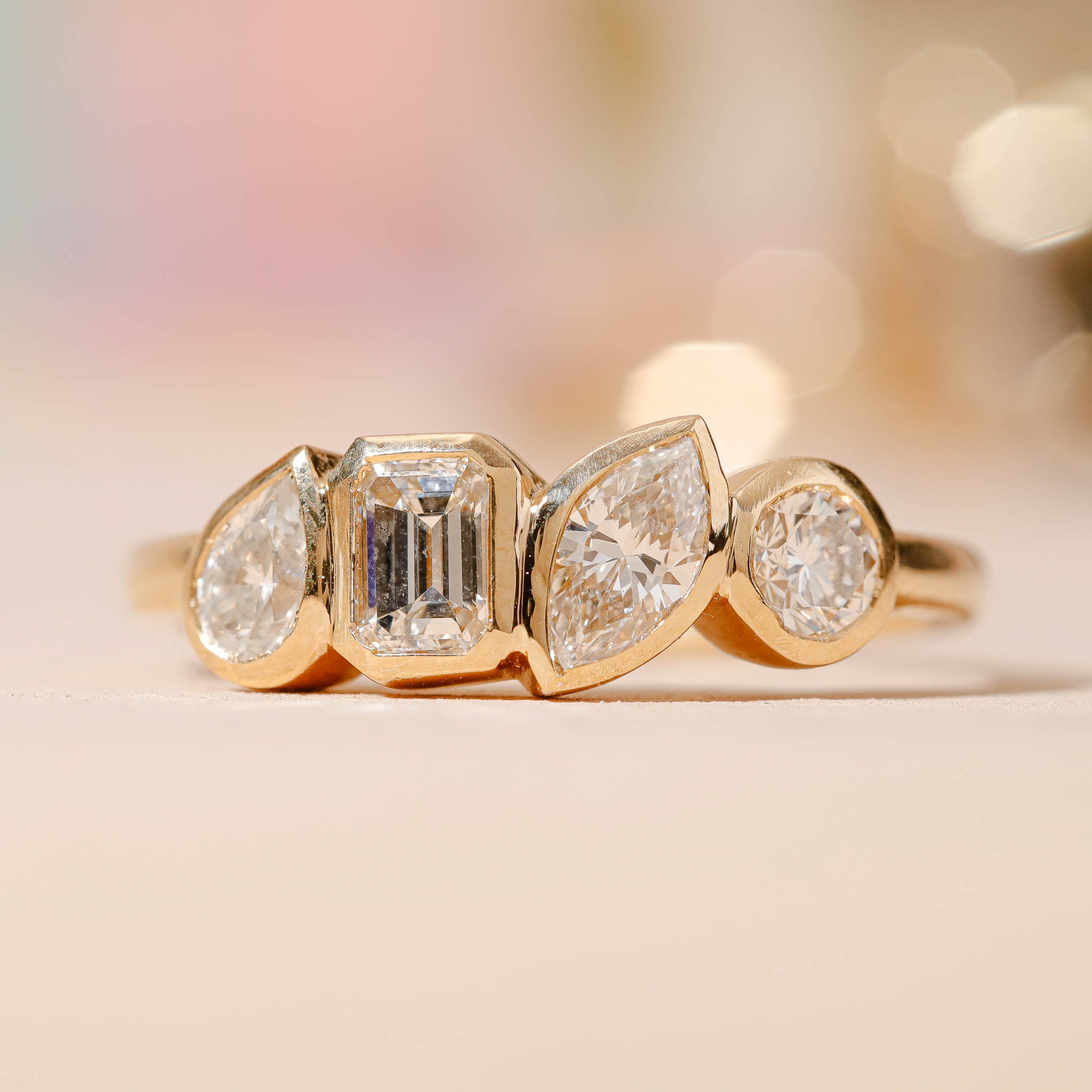Four distinct diamond cuts set in bold bezels, creating a rhythm of geometry and light. The arrangement is both structured and organic, forming a modernist cluster that gleams from every angle.