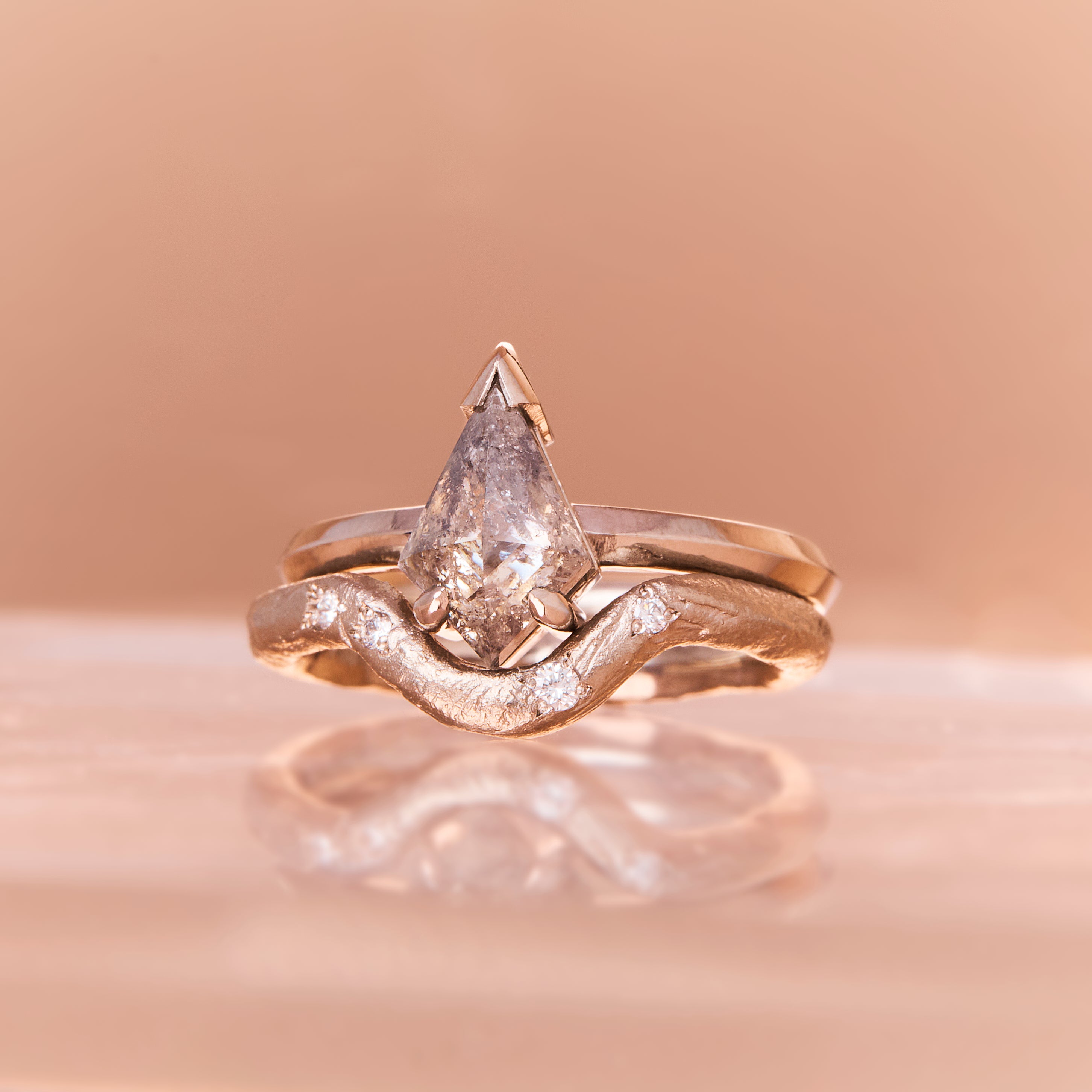 A modern solitaire ring featuring a kite cut salt and pepper diamond set in 18kt white gold. The stone is held within a drop-style double basket and framed by a geometric picture-frame setting, accentuating its raw, ethereal beauty.