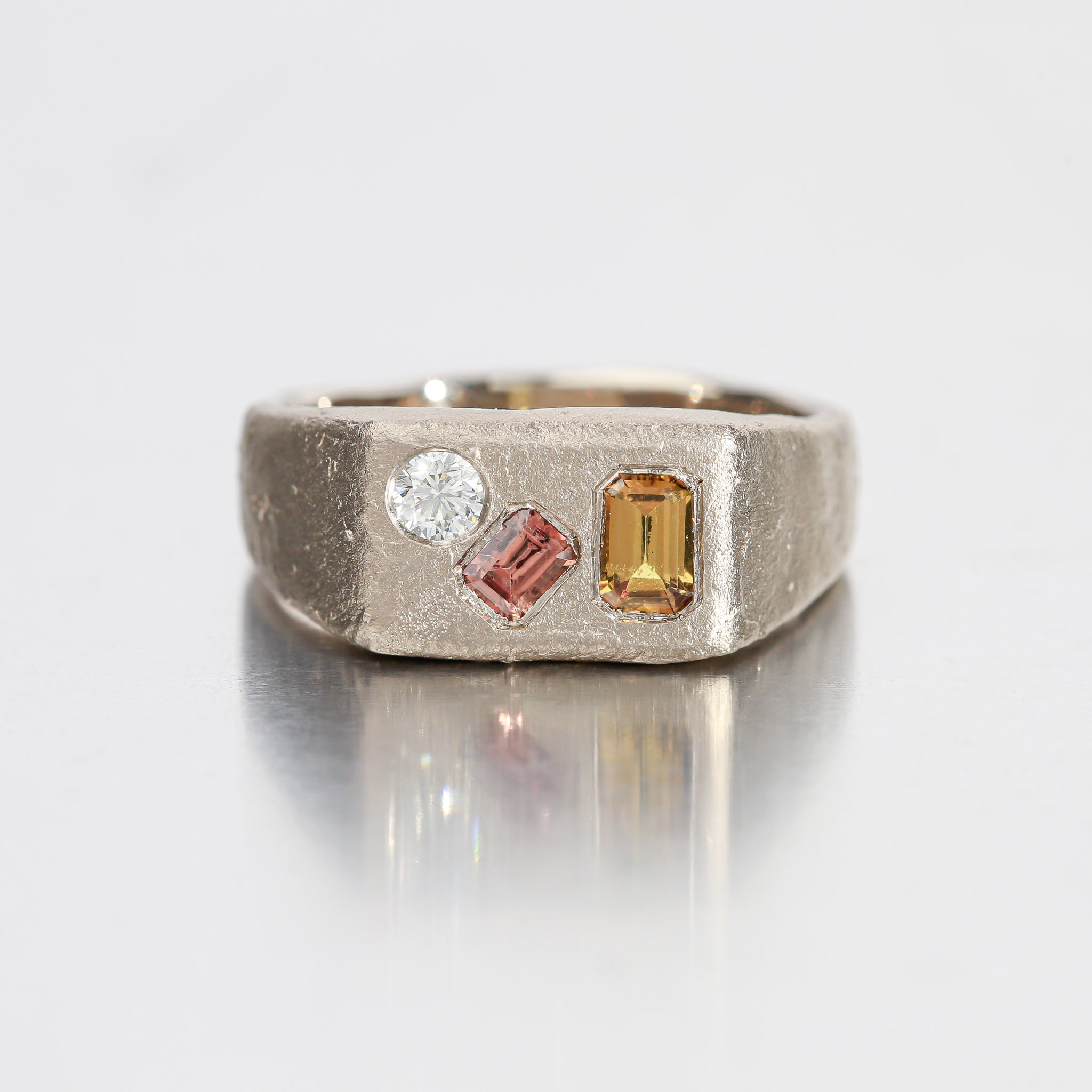 A white gold organic signet, softly textured with an elemental feel, flush set with two warm-toned Ceylon sapphires and a round white diamond.