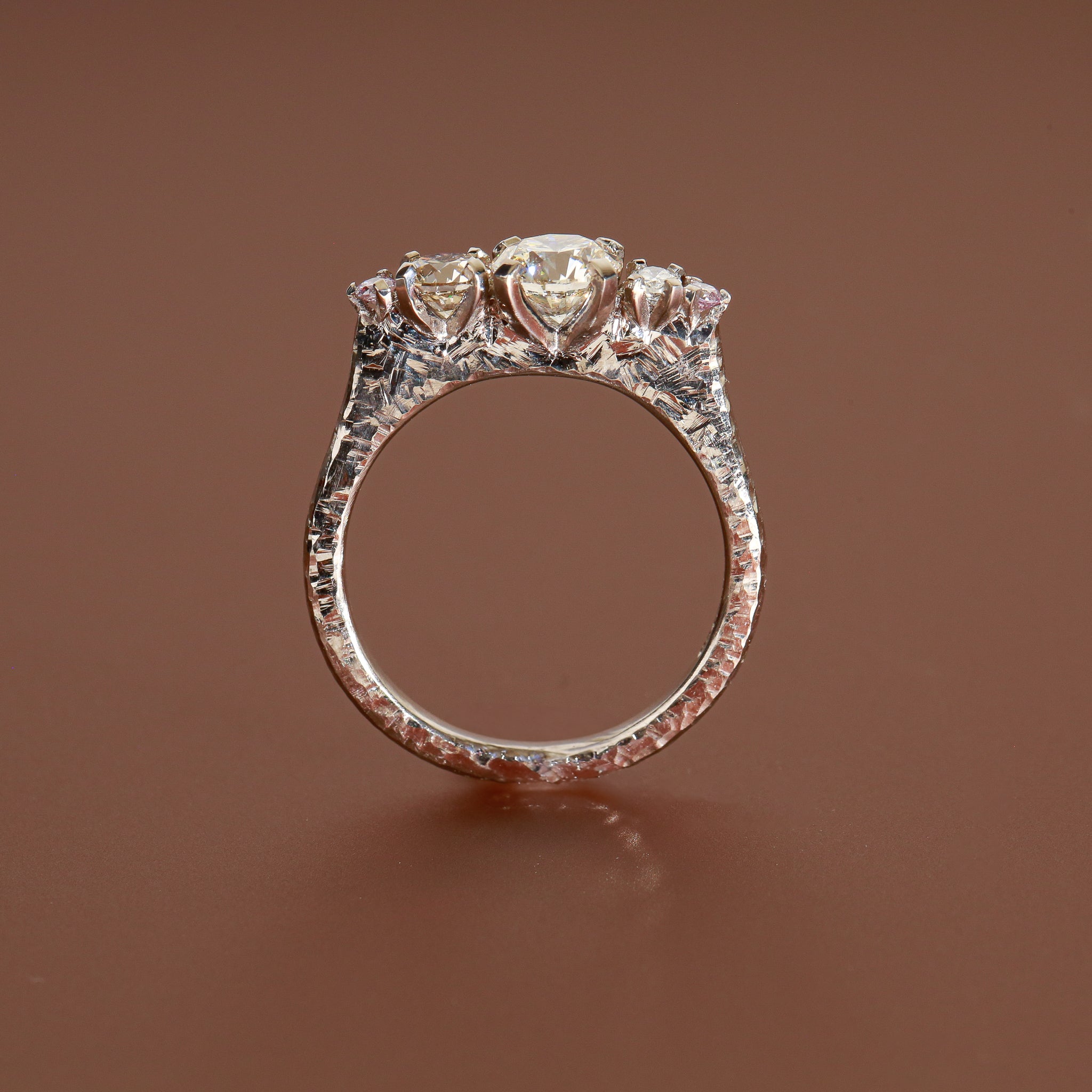 This five-stone line up engagement ring features three brilliant-cut white diamonds, framed by two soft blush-pink diamonds that add a whisper of colour. The white gold band was intricately wax-carved for a textured finish, giving it an artisanal depth and tactility that catches the light from every angle.