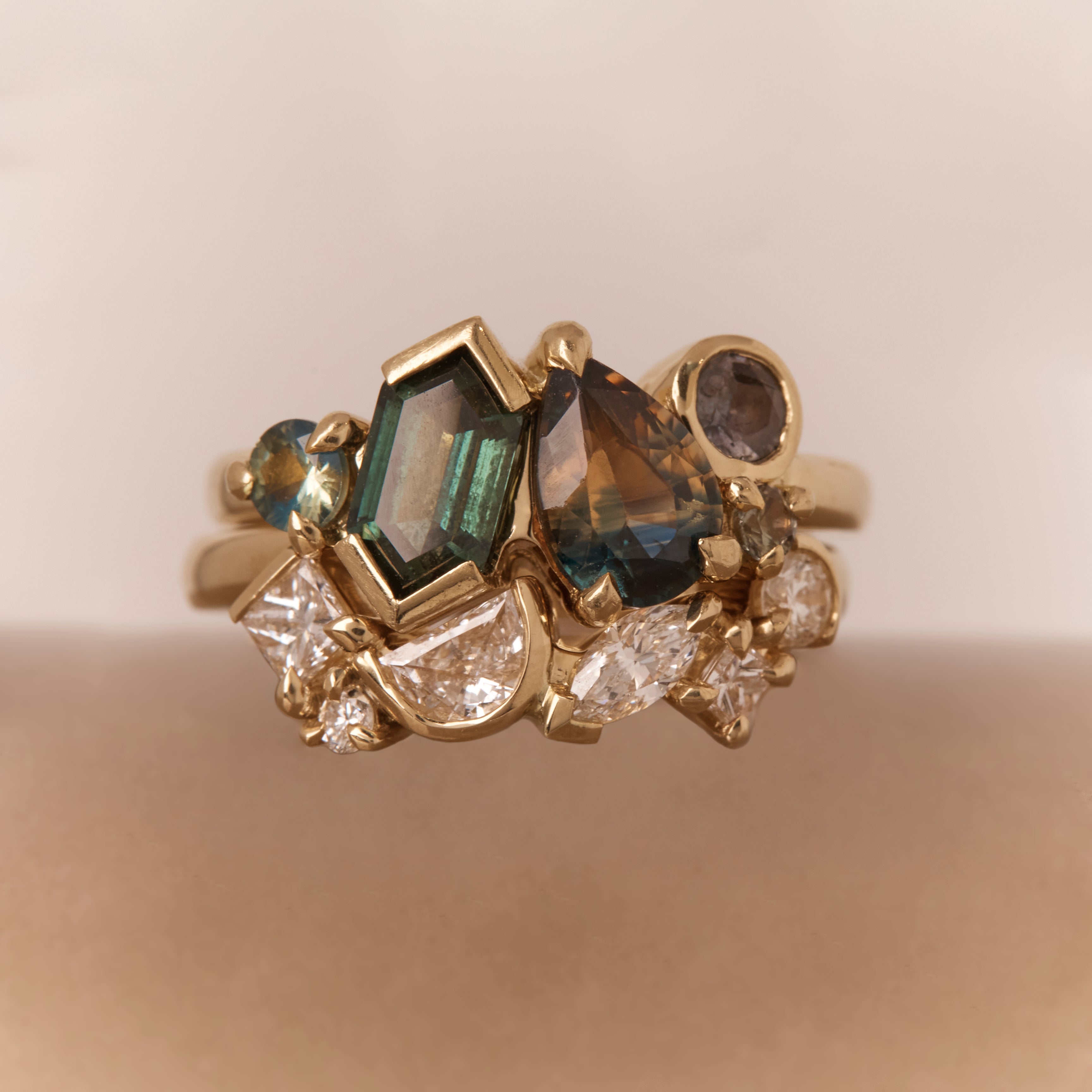 A composition of shifting hues and asymmetrical form. This sculptural cluster unites sapphires in tones of blue, gold, lilac, and warm brown. An ode to earth’s natural palette, balanced yet untamed.