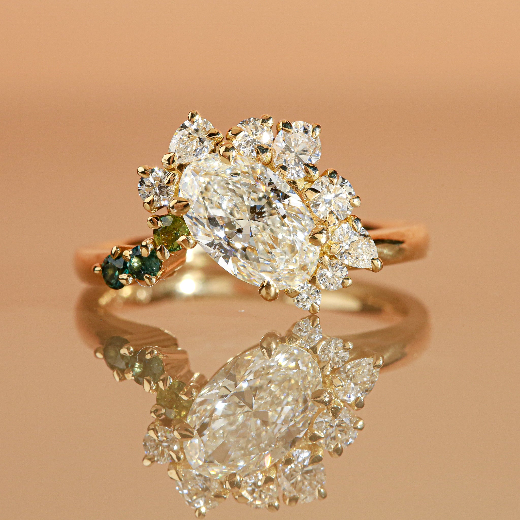 An oval diamond takes centre stage, encompassed by a constellation of mixed-cut white diamonds and green sapphires. The asymmetrical halo creates a landscape of sparkle that feels both vivid and organic.