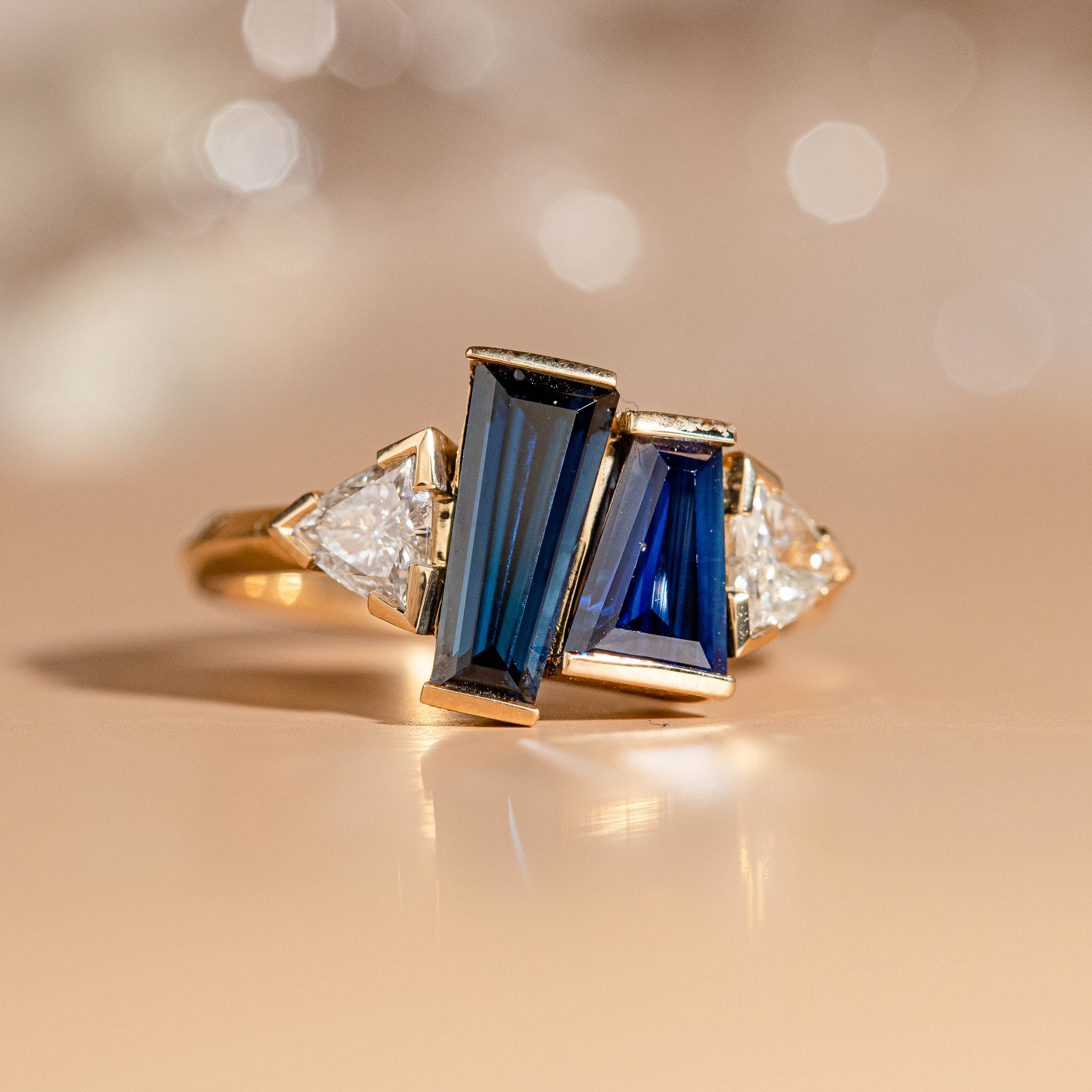 Two tapered baguette sapphires in deep, shifting blues sit in bold alignment, their angular silhouettes framed by bright trillion diamonds.