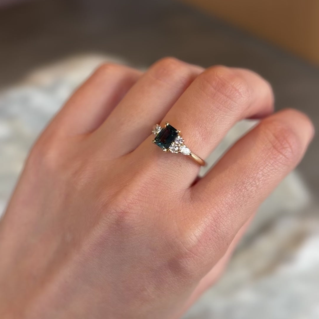A luminous emerald cut sapphire nestled among a scattering of ethically sourced diamonds.