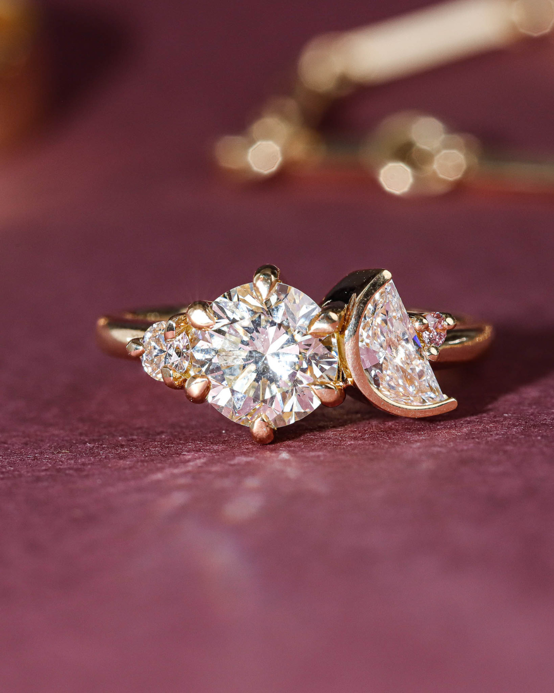 The interplay of the contrasting shapes of the round brilliant cut, symbolising the radiant sun, and the unique half-moon cut diamond, that bathes the design in a cool moonlight, creates a mesmerising visual symphony that celebrates the beauty of our sky.