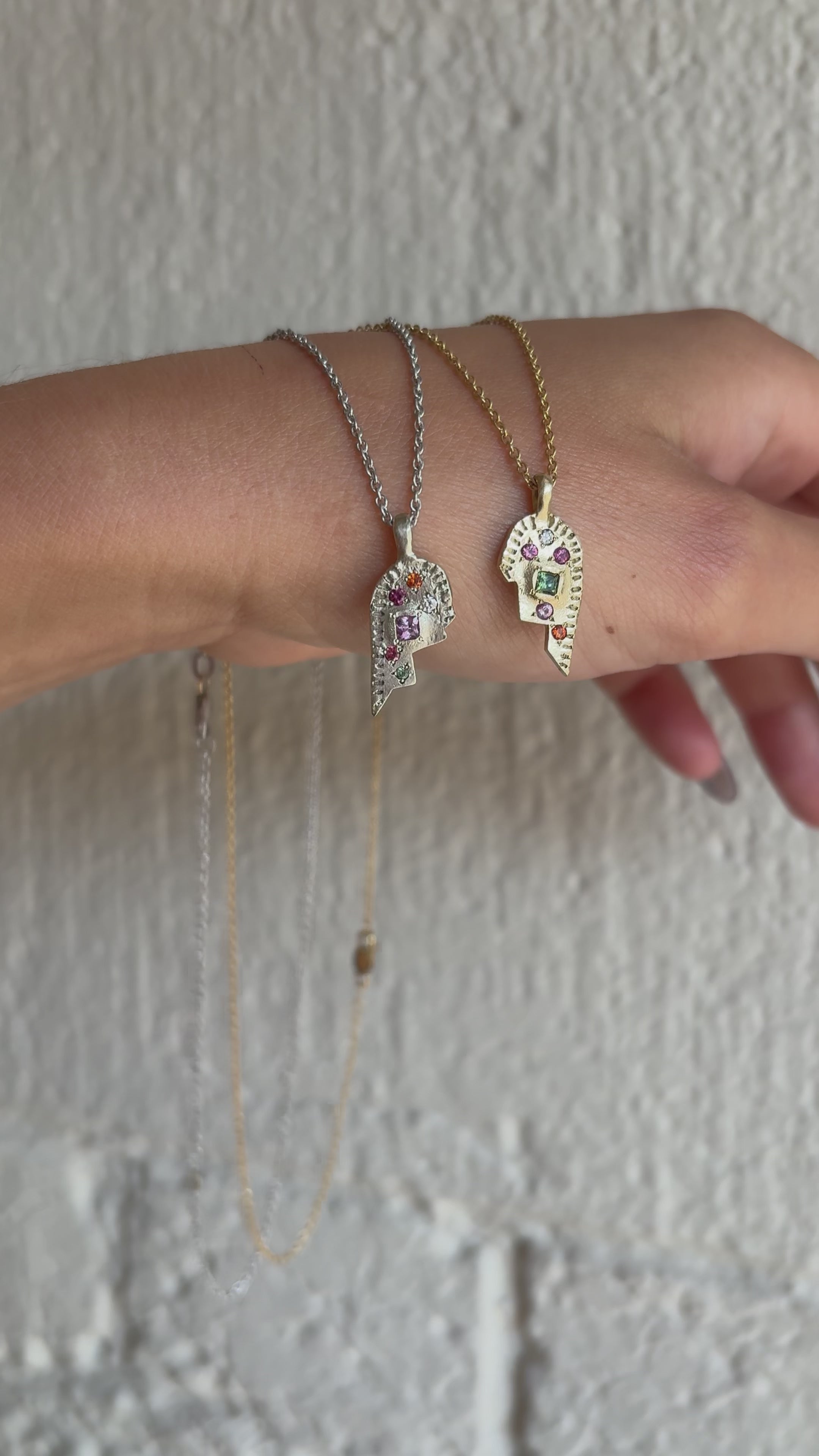 The Two of Hearts Necklace is a set of two half-heart pendant necklaces intended to be shared with your twin flame.